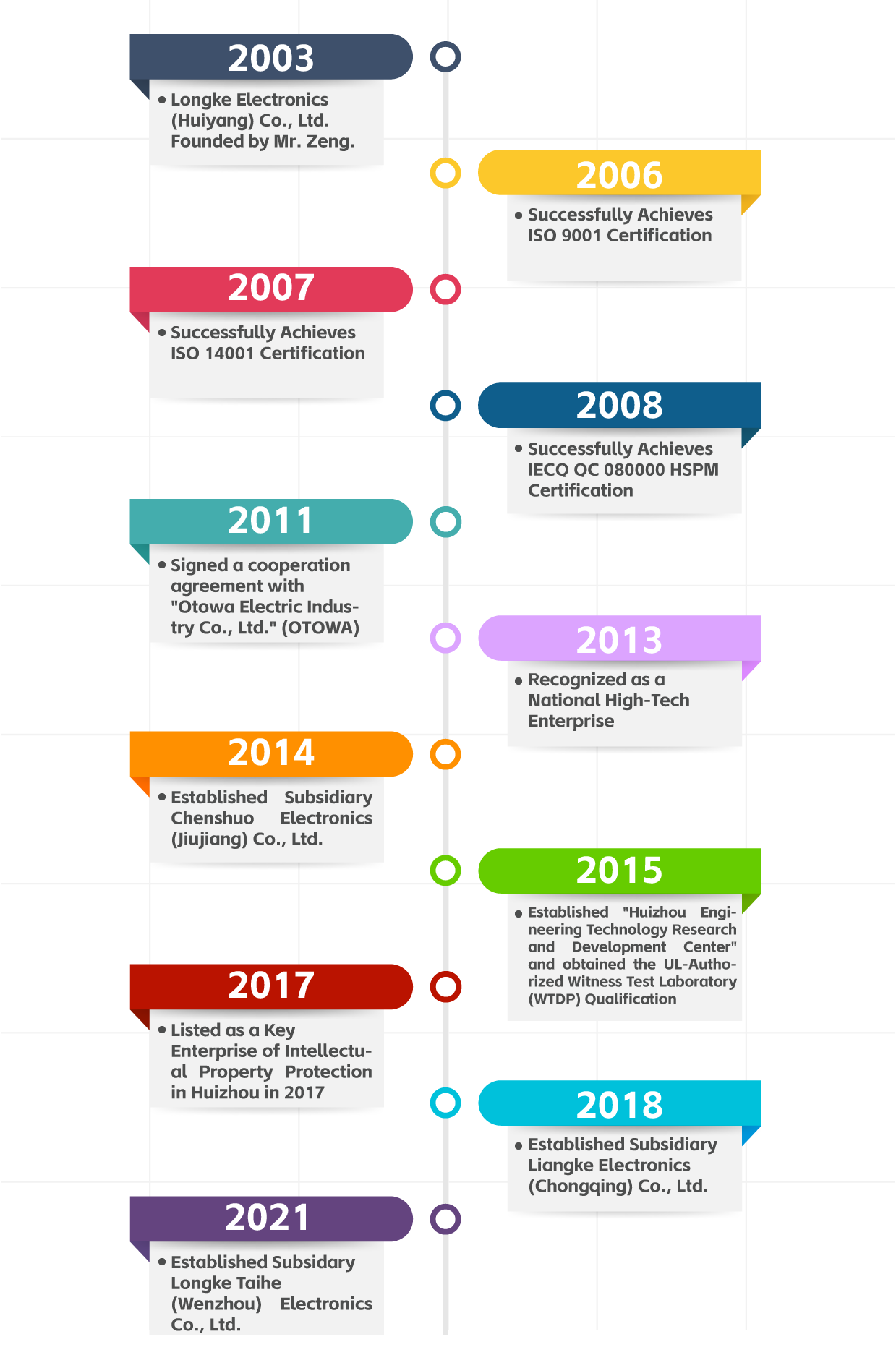 ? ? ? ?Longke Electronics (Huiyang) Co., Ltd. was established in April 2003. It’s an enterprise specializing in the research and development, production and sales of SPD varistors. The company is a four-story building with a construction area of around 5,000 square meters and currently has about 160 employees.